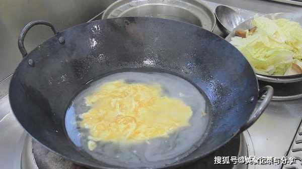 食材准备好以后,我们把鸡蛋煎一下,锅内烧油,热油充分滑锅以后,倒出热油,倒入凉油