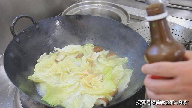 水烧开以后,倒入白菜和香菇,加入鸡粉4克(2勺子),鸡汁2克,搅拌化开调料,小火煮3分钟左右。