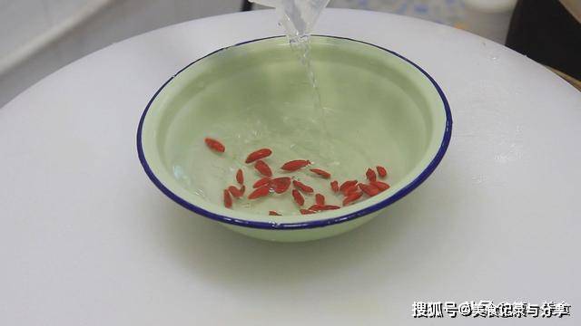 首先我们准备一个小盆,抓入一把枸杞子清水泡上。