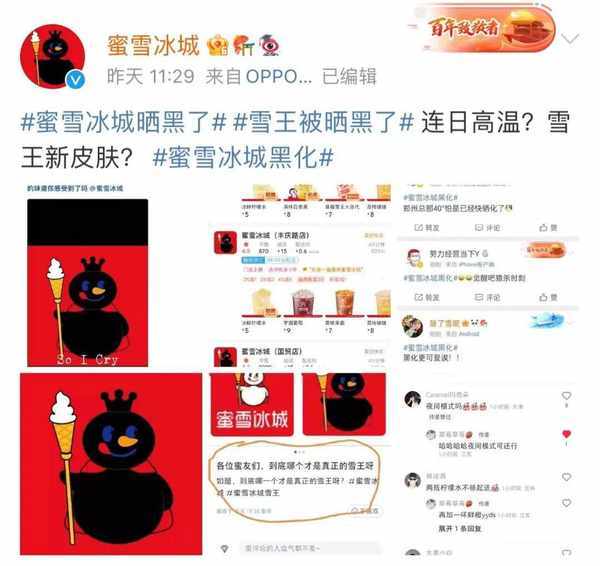 作为总部在河南的品牌,雪王天天跟个街溜子似的,晒成古娜拉黑暗之神,也是合乎情理的。无论是真黑化,还是被晒黑,反正最后讨论度高了,热度有了,新品销售量也上来了。
