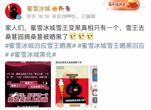 最后,随着热度的大涨,蜜雪冰城揭开了谜底:桑葚园摘桑葚被晒黑了。并顺势推出了自己的桑葚新品。