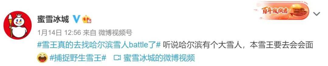 而蜜雪冰城的作风就是“一有事儿,它准上”,上一秒微博官宣去battle,下一秒就骑着三轮车去哈尔滨认亲。