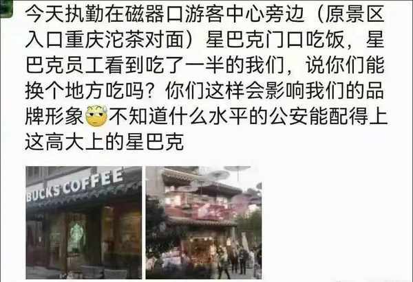 还记得去年重庆星巴克的事情吗?简单来说,就是几个执勤的工作人员去星巴克门口借地方吃饭,却被星巴克员工以“影响品牌形象”将人赶走并投诉,引起网友的抵制。