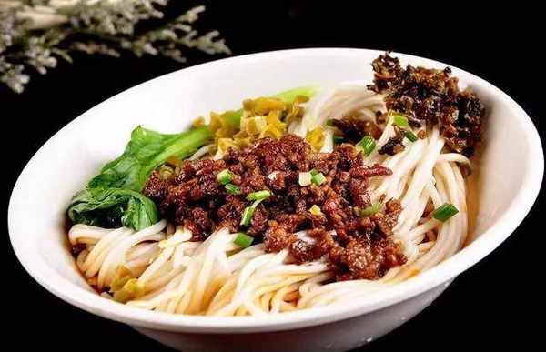 担担面是成都有名的小吃。它是用面粉擀成的面条,煮熟后舀上炸猪肉做成的。准备好的面条薄而脆,咸而微辣,香气浓郁,非常可口。这道菜在四川广为流传,在成都的宴席上常被用作担担面点心。