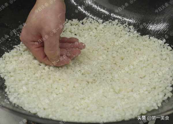 开始往锅里倒油,慢慢加入。如果你加太多的油,米粒会很容易散开,油几乎等于大米。