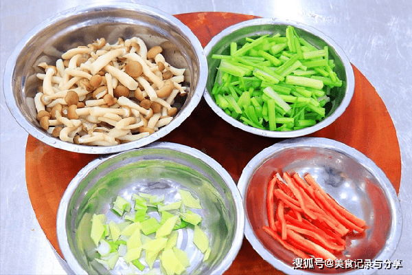 准备一把新鲜的蟹味菇,去除根部,放入清水中多抓洗两遍。把比较大的芹菜从中间划开,切成段,洗干净备用。准备半根红椒,切成丝用来配色。切点葱花、姜片备用。