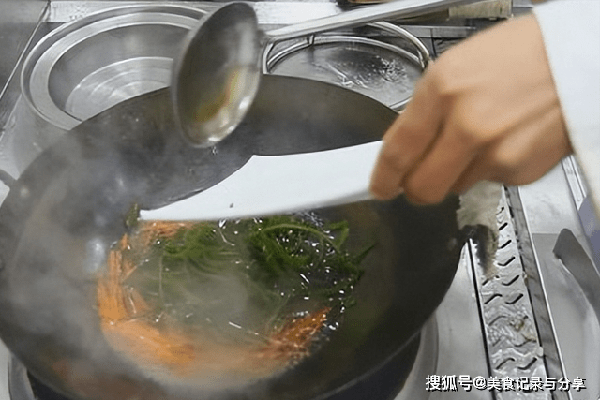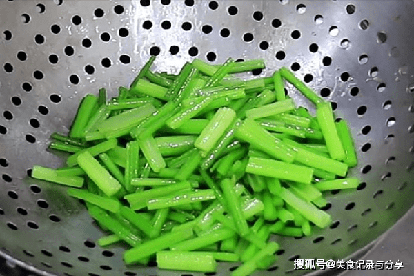 锅内烧油,油温五成热时倒入芹菜段翻炒1分钟左右,芹菜断生、返青以后加入少许食盐,转大火快速翻炒几下,倒出来备用。