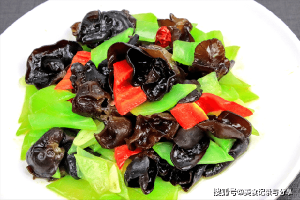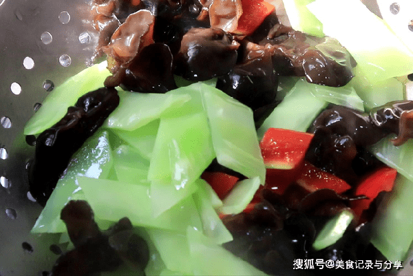 锅内加入清水,倒入少许植物油,水烧开以后,倒入准备好的木耳、莴笋和红椒,焯水30秒左右 食材断生以后即可倒出