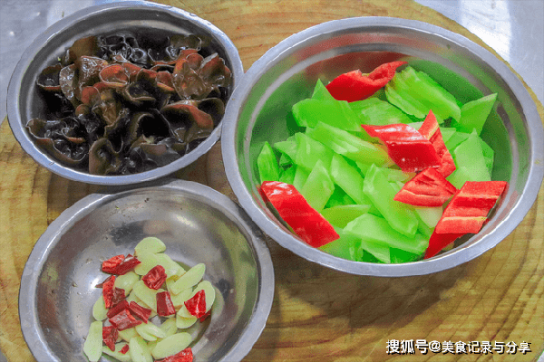 莴笋一根把外皮削干净,改刀切成菱形片,红椒半个也切成菱形片,泡发的木耳一把,把比较大的切开,大蒜几粒切成片,再抓入几粒干辣椒。