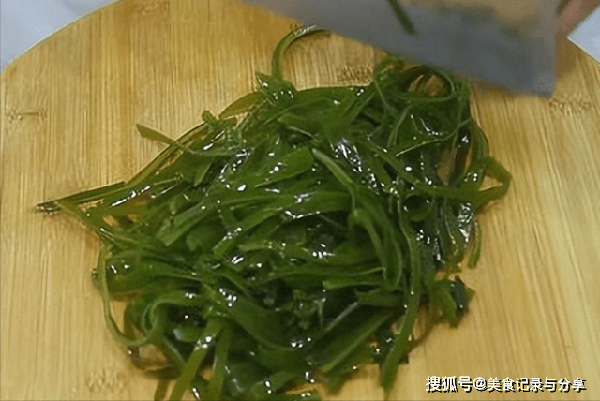 把海带丝洗干净,切几刀即可,装入盘中。胡萝卜一小块先削去外皮,再切成细丝,丝切得越丝越好入味。大蒜几粒拍扁后切成碎末。