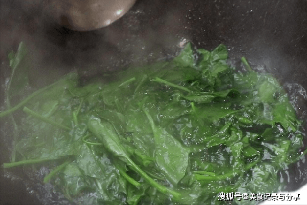 锅内烧水,加入少许食盐和植物油,让菠菜色泽更加鲜亮防止营养流失,水烧开以后放入菠菜,焯水能够减少菠菜中的草酸,菠菜断生后倒出来,用清水冲洗,冷却控水。