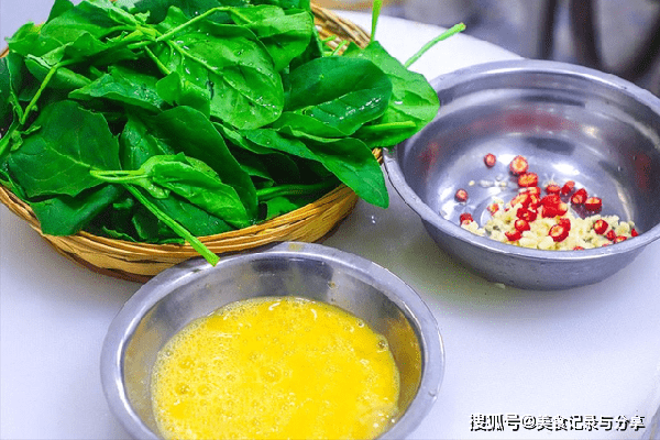 盆中倒入蒜末、小米椒,加入食盐1克,味精1克,白糖少许提鲜,生抽5克,陈醋5克,香油5克,葱油5克,放入菠菜、鸡蛋皮,颠盆拌匀后即可,一道营养又健康的菠菜鸡蛋就做好了。