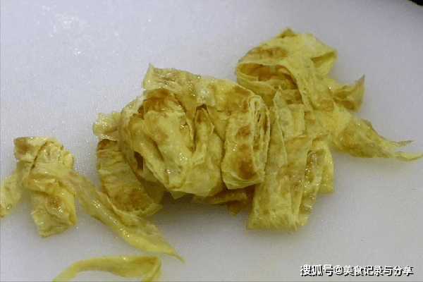 锅内烧油,充分滑锅,烧热以后倒出热油,倒入一半鸡蛋液,轻轻转动锅,利用余温把鸡蛋液铺成圆形的鸡蛋饼。鸡蛋饼周围翘起时翻面,把另一面也煎黄煎定型即可出锅,把煎好的蛋饼叠起来,切成宽条备用。
