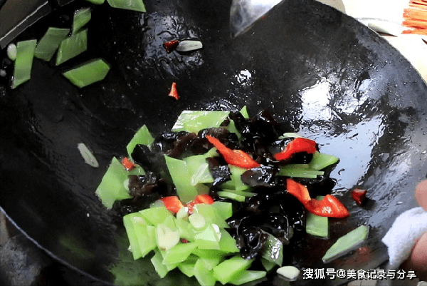 锅内烧油,油烧热以后,倒入蒜片和干辣椒,翻炒出香辣味,倒入控干水分的木耳莴笋,翻炒均匀后起锅调味。