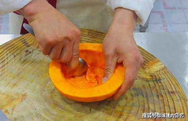 首先我们准备一下食材,圆圆的南瓜一个,从中间切开,一分为二。削去南瓜外皮,削干净后,用勺子挖去瓜瓤,