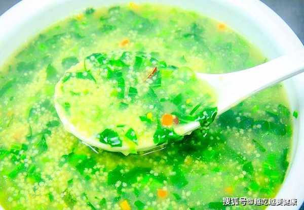 4.熬制期间,把锅中的浮沫打干净,这样煮出来的小米羹会更加的晶莹清澈,大约熬制3分钟,小米开花以后把芥兰倒入锅中搅拌均匀,继续煮至小米羹微微烧开,勾入半勺芡粉,把小米羹调得稠一点,以免过于寡淡,小米羹再次煮开后即可出锅,这道清淡养生的芥兰小米羹就做好了。