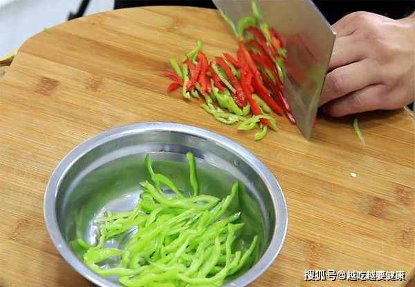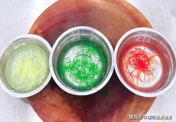 4.切点葱丝、姜丝、红椒丝分别放入清水中浸泡一会儿。