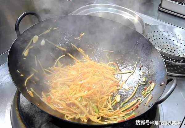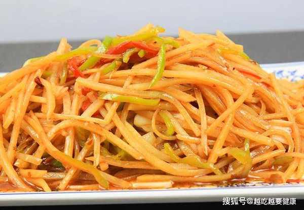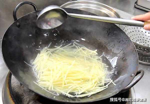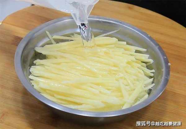 3.锅内烧开水,快烧开时放入土豆丝,焯水20秒左右倒出控水,快速用凉水冲洗,保持清脆的口感。