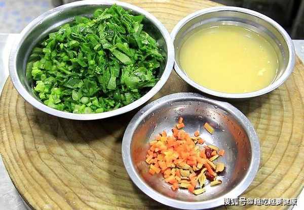 1.准备鲜嫩的芥兰一小把,切成碎末;准备一把小米放入清水中,抓洗干净以后浸泡10分钟,把小米泡开更容易煮熟;再切一点红枣粒,增加小米羹的营养;胡萝卜一小块切成丁,用来配色。