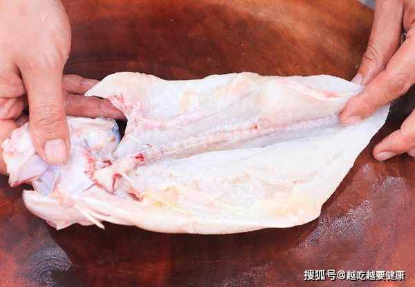 1.准备一条新鲜的鲈鱼,已经宰杀干净了,先沿着脊背把两侧划开,因为背部的肉比较厚,这样处理更容易蒸熟,再从腹部片开让鱼能够展开。