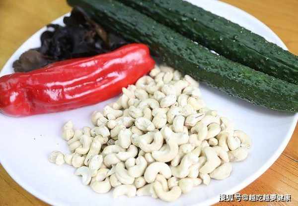 1.准备两根黄瓜,把外皮削干净,破成几半去除里面的瓜瓤,其实主要是瓜瓤容易出水;半个红椒切成片,用来搭配颜色;一小把泡发的木耳,去除硬根切成小块;适量腰果仁放在碗中备用。