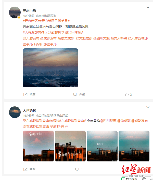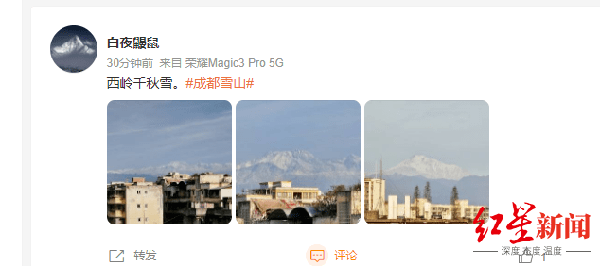 据此前成都年度观山报告显示,2022年成都人52次推窗邂逅雪山,这已经是成都观山爱好者连续6年发布观山大数据。2021年,在成都共有63次可遥望雪山,2020年有70次,2019年有65次,2018年有56次,2017年有50次。镜头见证生态变化,田相和等摄影爱好者推测,今年望见雪山的次数值得期待。