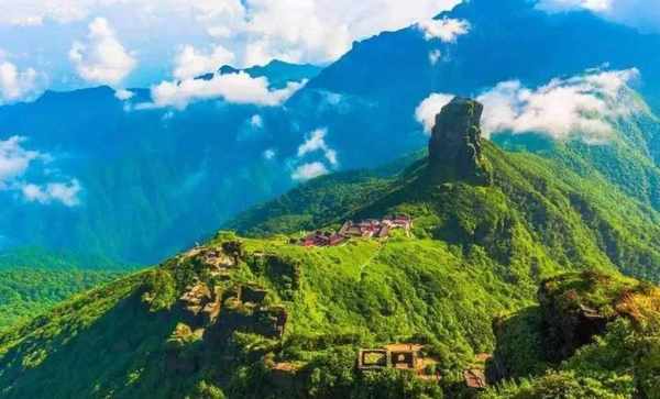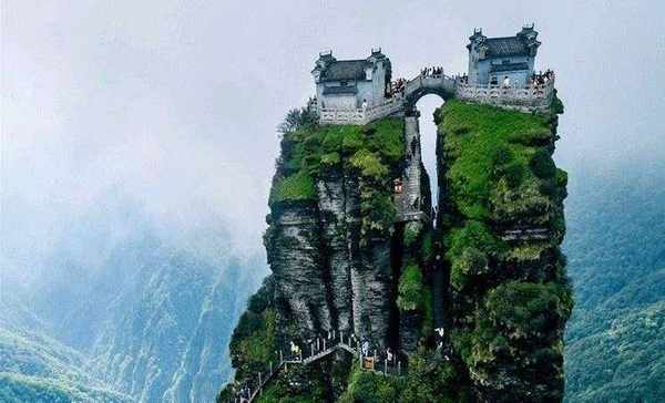 梵净山山峰雄厚、层峦叠嶂、悬崖峭壁,直冲云霄,在山地仰望梵净山山顶,根本看不到其山顶,远远望去,山顶直冲云霄,雾气朦胧,就好像置身于“人间仙境”。在梵净山海拔两千多米的山顶上,建有佛家的两座寺庙,虽然寺庙位于悬崖峭壁,险峻至极,却有络绎不绝的游客来供香火。据说有缘之人在云端看到佛光,怪不得人称“人间仙境”。