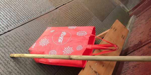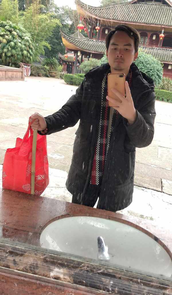 3月9号,7点不到就拿着竹竿和提着一个很土的红色可乐袋(里面装着一个保温杯、一个充电宝、一个充电器、一个转经轮、一张地图批、一瓶饮料、一个橙子、两副冰爪、一张雨披、一包葵瓜子,几包纸巾,其它的都没有了。)出发了,像我这么土出门的游客大概是找不出第二个了。