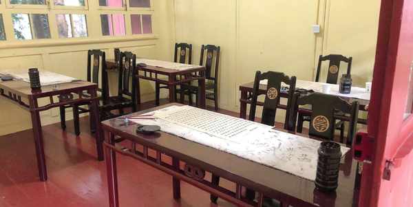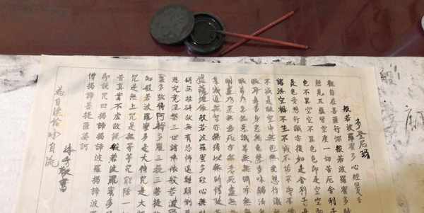 中午在寺院里逛了逛,发现了抄经堂和茶室。看到桌子上放着一篇临摹过的《心经》摹本,几乎没有一笔用心写过,不由心生感慨:心得有多乱才能临摹成这样?