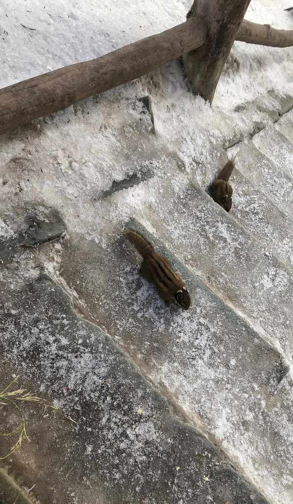 途中遇到小松鼠和猴头,我叫它们“小宝贝”,很友好地跟它们说话,念经咒给它们听,都很温顺乖巧。