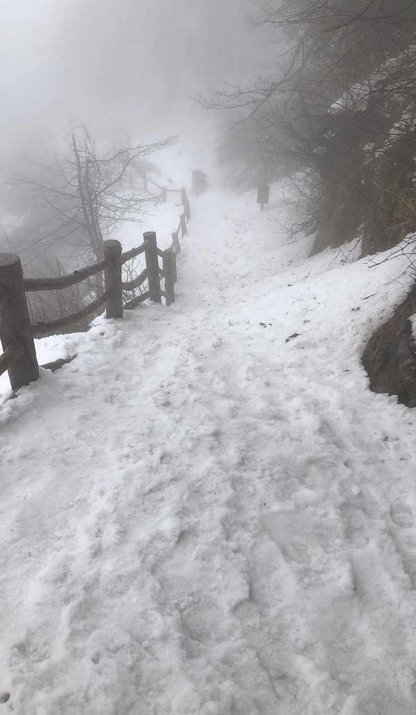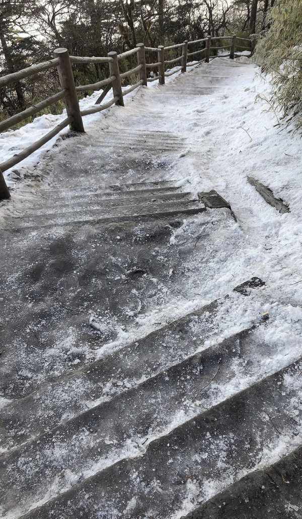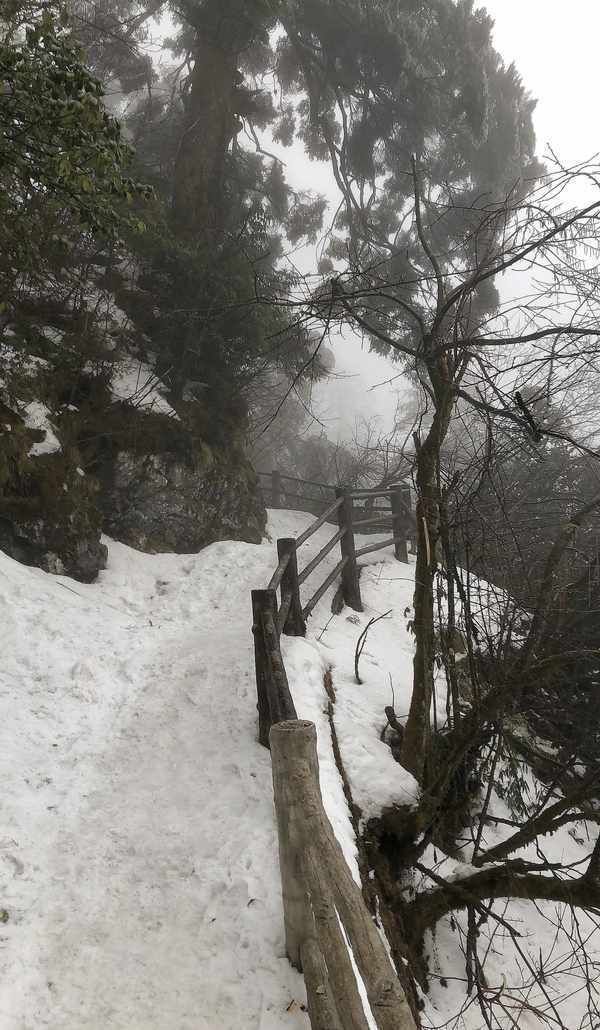 灵觉寺到洗象池这段是最难走的,因为雪地已经变成了冰雪地,这个很“恼火”,尤其是下坡的时候,很滑,那叫一个寸步难行,必须得十分小心一步一步踩稳了,途中我摔倒过两次,这个时候很容易心态崩了,但是索性我是享受这段过程。