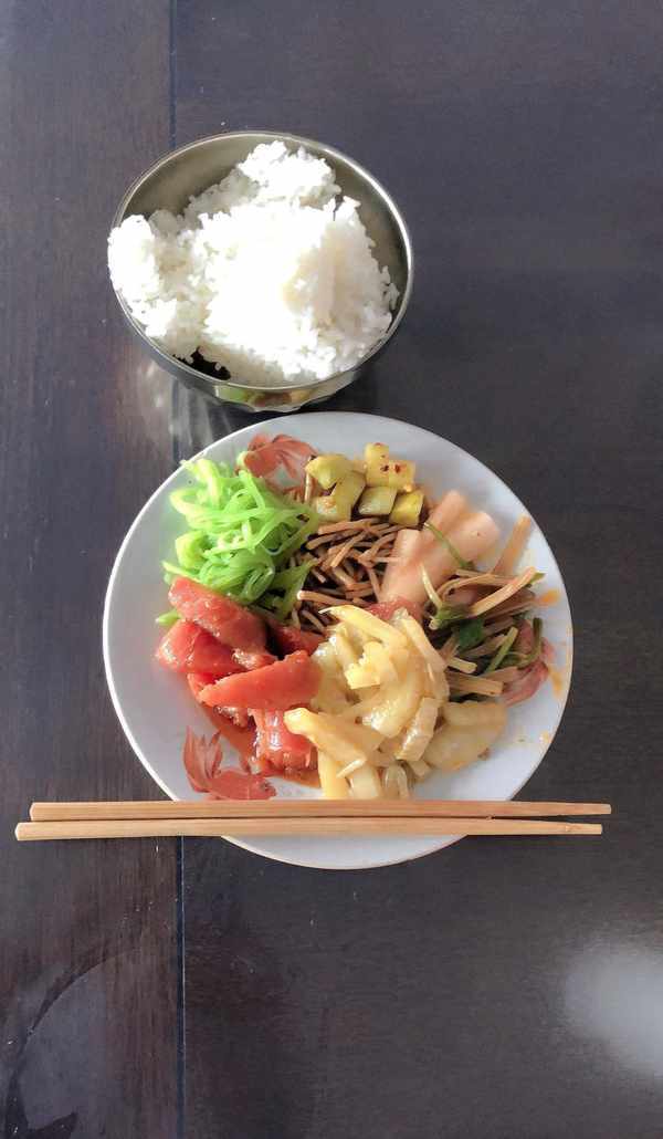 一天下来,早餐吃了两个白面馒头,途中吃了两个蛋炒饭,入住洗象池寺院(人生中第一次住寺院)后吃了斋饭,一天全素。斋饭很简单,气质清淡,很多人可能吃不惯,我却觉得很好吃。