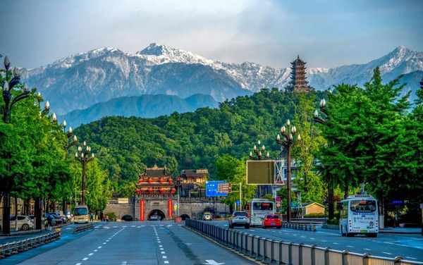 雪山映衬下的都江堰古城门,掩映在一片苍翠中。/视觉成都
