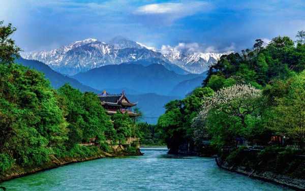 都江堰宝瓶口与远处的雪山交相辉映。/视觉成都
