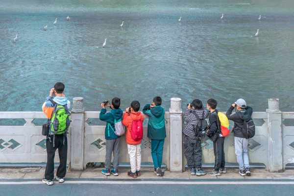 锦江中矗立的苍鹭,吸引了一群年轻的观鸟者们在岸边绿道上驻足观望。/视觉成都