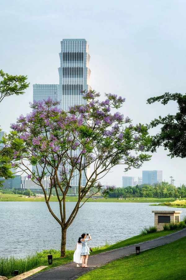 天府公园,秦皇湖畔,蓝花楹树下,打卡的市民。/视觉成都