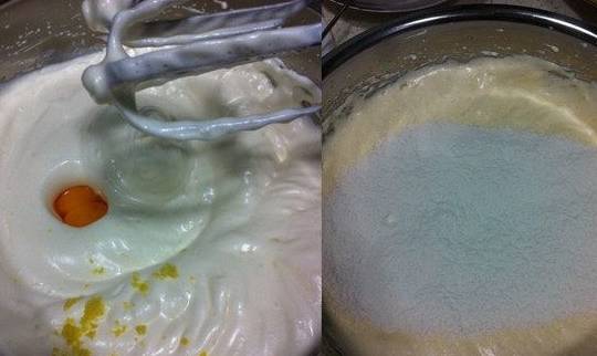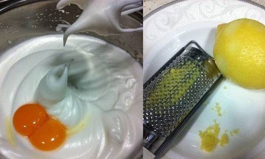 4、分次加入蛋黄,提高一档将蛋黄融合在蛋白糊里,再刨适量柠檬皮备用;