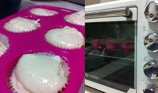 6、将拌好的蛋糕糊加至到有纸托的烤模里,入预热好的烤箱160度烤制20分钟即可;