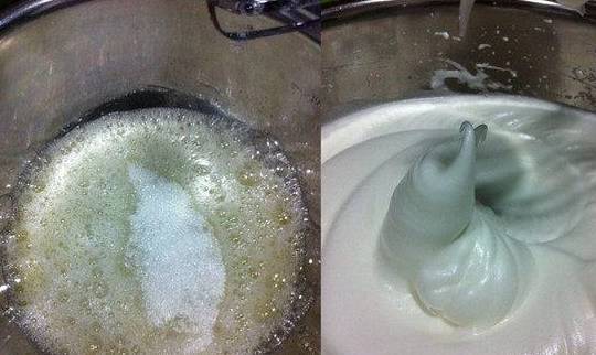 3、先将蛋白打至粗泡,再分次加入白糖,打至蛋白发泡备用;