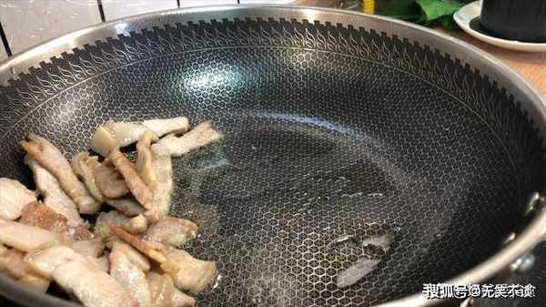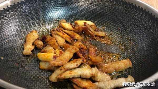 5、起锅,倒入少量的油,加入切好的猪肉片,调成小火,煸炒一下,炒至猪肉出油,微微的焦黄,然后把猪肉堆在一边。如果你用的是不粘锅可以尝试下不放油,但是要把猪肉铺满整个锅面,因为不粘锅不能空烧,容易烧坏涂层。