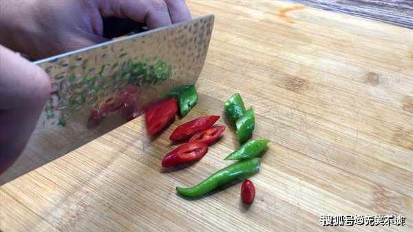 3、青红辣椒切成斜段,辣椒配五花肉再好吃不过,想想都流口水,当然也可把青辣椒换成青蒜,不喜欢吃辣的也可以把辣椒换成青椒和红色的甜椒,颜色也是一样的漂亮。