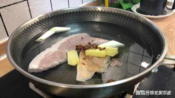 2、把猪肉放入装有冷水的锅中,加入葱段、姜片、大料、料酒,来上几粒花椒,盖上盖子,大火烧开,把浮沫子捞出,用中小火煮,煮至猪肉能用筷子能插透就可以了,大约需要半个小时左右,然后给它捞出控干水分晾凉备用。