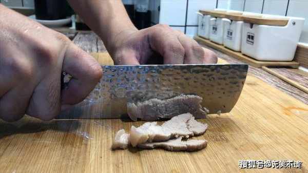 4、晾凉控干水分的猪肉切成片,要让五花肉的猪皮立起来切,这样比较的好切,还可以放进冰箱中冷冻上20分钟,这样就非常的容易切片了,厚度不要超过5毫米,太薄容易卷,太厚又不好吃。