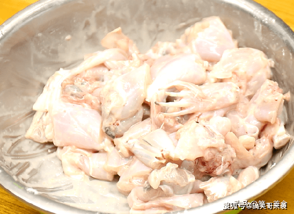 宰杀干净的牛蛙去除脚趾以后切成小块放入盆中,加入食盐、味精、胡椒粉、料酒去腥再抓入一小撮淀粉,抓拌均匀腌制10分钟给牛蛙码底味。