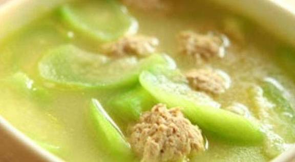 2、锅里倒入足量的清水大火煮沸,放入肉丸继续烧煮至肉丸变色,下入丝瓜块烧至丝瓜变透明,最后调入少许加盐调味拌匀即可出锅。