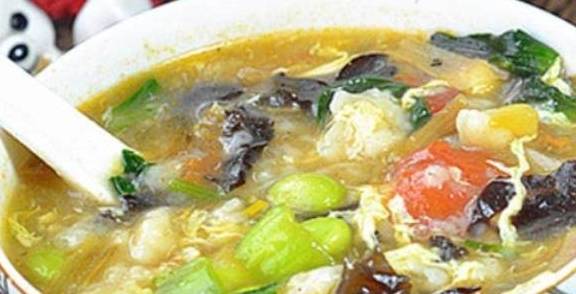 3、均匀地加入面疙瘩略煮一会,淋上蛋液,最后加少许鸡精、胡椒粉、香油、香菜碎和盐拌匀即可食用。