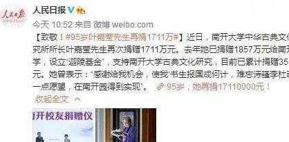 【致敬!#95岁叶嘉莹先生再捐1711万#】近日,南开大学中华古典文化研究所所长叶嘉莹先生再次捐赠1711万元。去年她已捐赠1857万元给南开大学,设立“迦陵基金”,支持南开大学古典文化研究,目前已累计捐赠3568万元。她曾表示:“感谢给我机会,使我‘书生报国成何计,难忘诗骚李杜魂’的一点愿望,在南开园得到实现”。