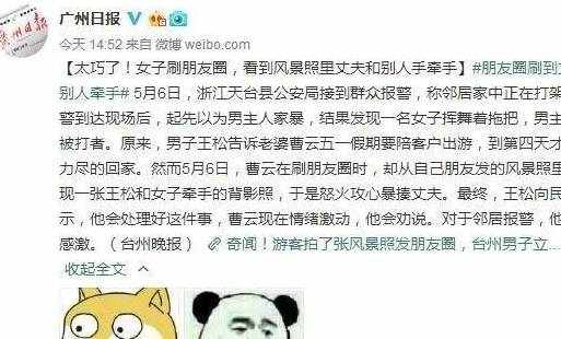 【太巧了!女子刷朋友圈,看到风景照里丈夫和别人手牵手】#朋友圈刷到丈夫和别人牵手#5月6日,浙江天台县公安局接到群众报警,称邻居家中正在打架。民警到达现场后,起先以为男主人家暴,结果发现一名女子挥舞着拖把,男主才是被打者。原来,男子王松告诉老婆曹云五一假期要陪客户出游,到第四天才精疲力尽的回家。然而5月6日,曹云在刷朋友圈时,却从自己朋友发的风景照里,发现一张王松和女子牵手的背影照,于是怒火攻心暴揍丈夫。最终,王松向民警表示,他会处理好这件事,曹云现在情绪激动,他会劝说。对于邻居报警,他表示感激。(台州晚报)