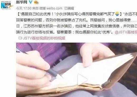 【“佩服自己如此优秀!”小伙诈骗后写心得民警看完都气笑了】“永远不要正面回答警察的问题,否则你就被警察占了先机。民警越问,我心里越得意......”近日,江苏苏州警方抓获一名诈骗犯,他经常上网搜集反侦查信息,并对自己的诈骗行为进行总结与反省。警察蜀黍:我也佩服你如此“优秀”。@JSTV荔枝视频