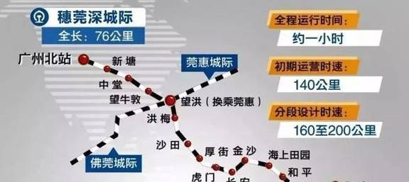 穗莞深城际轨道工程按建设时序按洪梅~长安金沙段、新塘~洪梅段、长安金沙~深圳机场段分步实施,里程范围DK7+592.97~DK83+860,全长约计76公里,速度目标值140km/h。